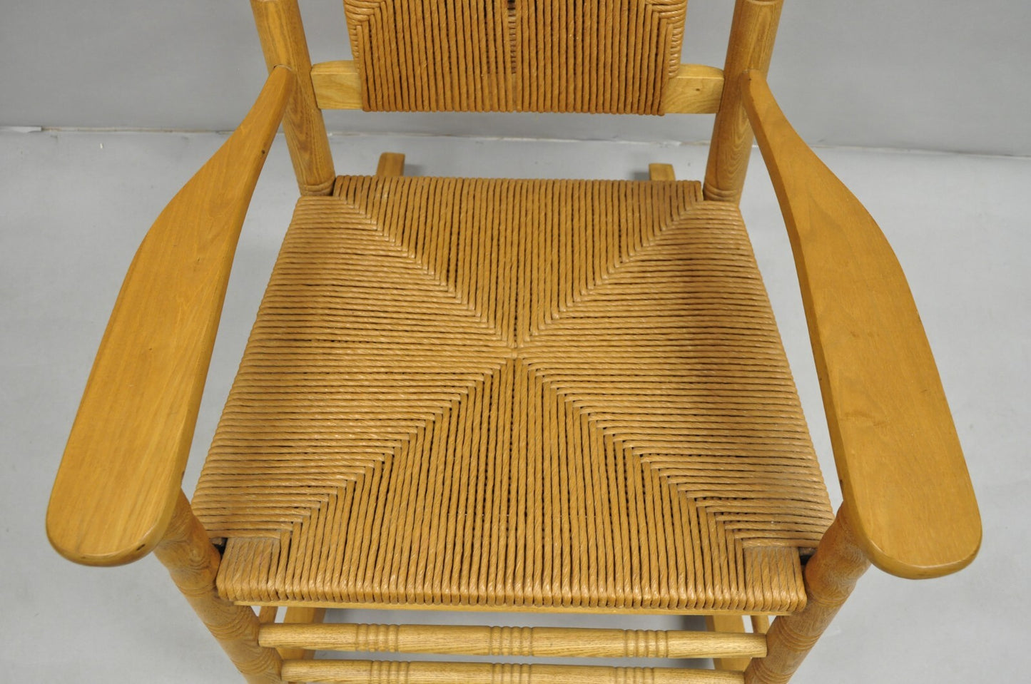 American Primitive Rustic Oak Wood Rush Seat Rocking Chair by Cracker Barrel. Circa Late 20th Century. Measurements: 46.5" H x 26.25" W x 34" D x 19" Seat height x 26" Arm height.