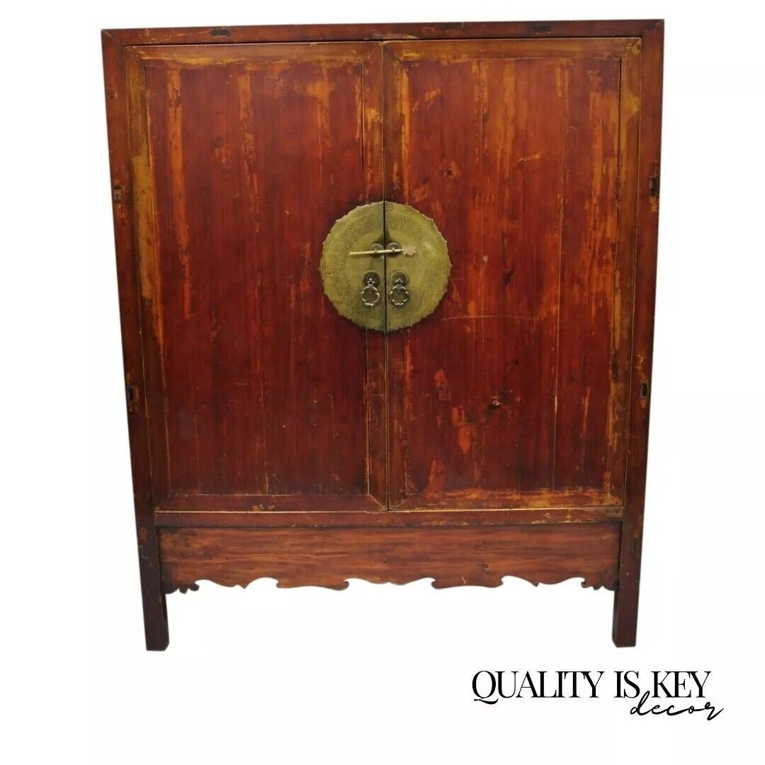 Antique Asian Red Lacquer Oriental Chinese Wedding Cabinet. Item features solid wood construction, beautiful wood grain, distressed red finish, nicely carved details, 2 swing doors, 2 drawers, solid brass hardware, very nice antique item. Circa Late 19th Century. Measurements: 60.5" H x 49" W x 21" D.