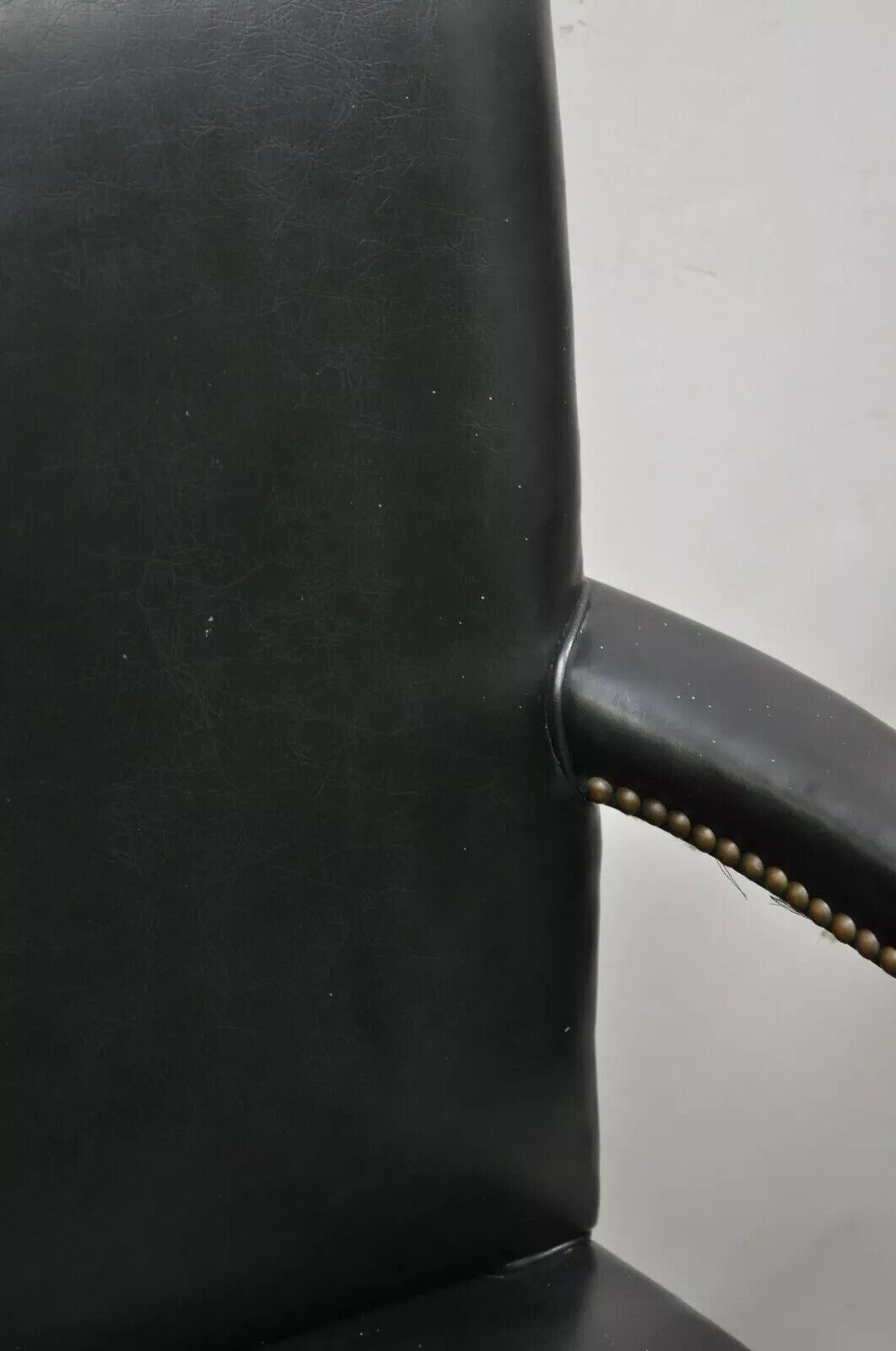 Antique English Georgian Style Dark Green Leather Library Office Chairs - a Pair. Item features nail head trim, solid wood frame, upholstered armrests, dark green leather upholstery, very nice antique item, quality American craftsmanship. Currently has plastic foot glides. Circa Early 20th Century. Measurements: 41" H x 26" W x 30" D x 19" Seat Height x 28" Arm Height