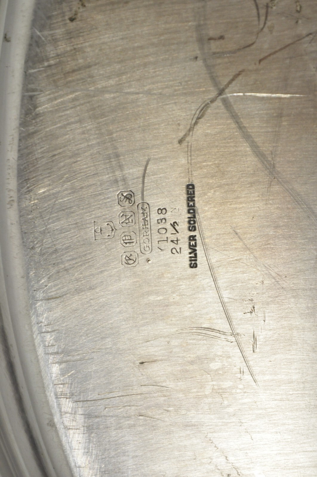 Antique Gorham Edwardian Silver Plated Twin Handle Serving Platter Bar Tray - Engraved to Reverend from Church, 1945. Engraving to center reads "Reverend and Mrs. L.M. Adkins, July 7th 1945 from First Methodist Church Schenectady, NY". Circa Mid 20th Century. Measurements: 1.5" H x 25" W x 18" D.