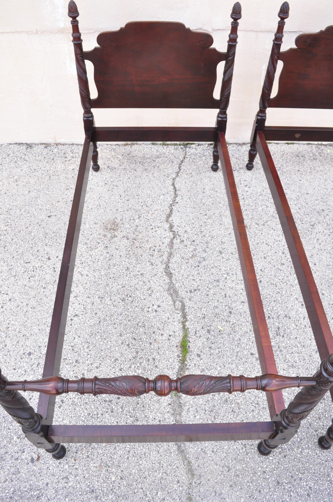 Antique Sheraton Federal Carved Mahogany Acorn Finial Twin Bed by Richter - Pair