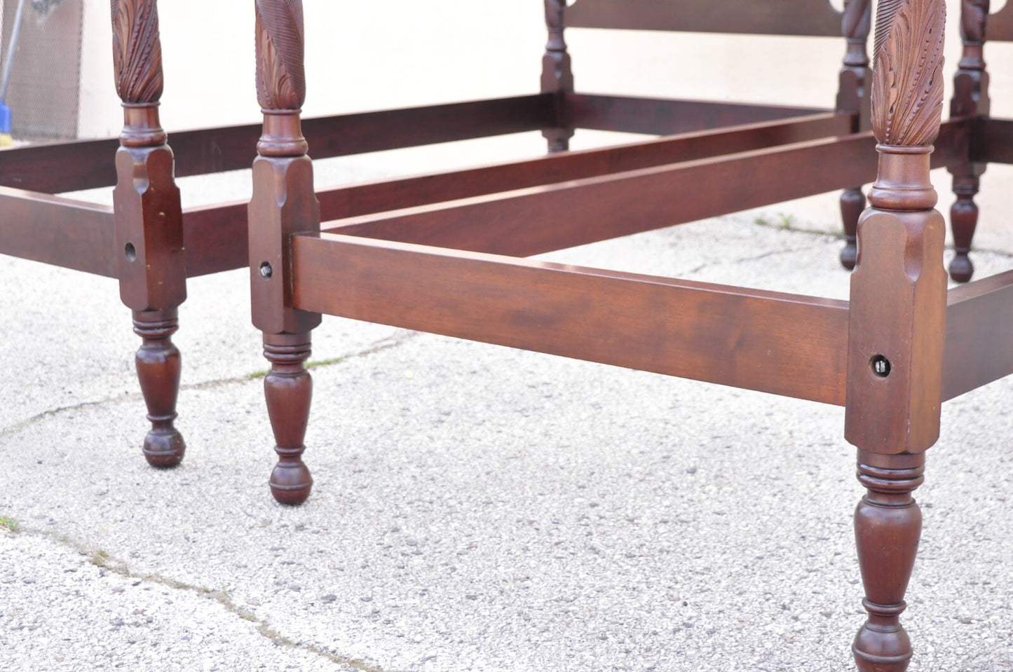 High Quality Antique Sheraton Federal Style Carved Mahogany Acorn Finial Twin Bed Frames by Richter - a Pair. *Please note, bed frames would take “Rabbet Edge” box springs which are similar to the single border, but notched to sit on TOP of the rail, as opposed to inside the rail. This allows for the box spring to sit flush to the outside edge of the bed rail. This box spring is often used for antique 4-poster and canopy bed frames. Circa Early 20th Century. Measurements: 48.5" H (Headboard) x 39" W x 81.5" D. Footboard: 45.5" H
