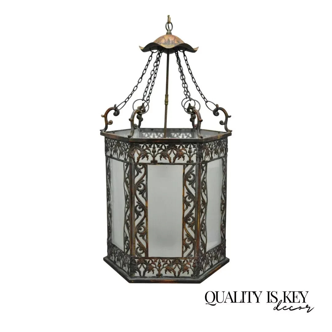 Antique Art Nouveau Slag Glass Hexagonal Gilt Metal Pendant Light Chandelier Fixture. Item features frosted slag glass panels, hexagonal gilt metal frame, floral scrollwork, lily pad canopy, chain supports, 3 interior candle holders, one interior light, distressed finish, great style and form. ***Currently 4 Available***. Circa Early 20th Century. Measurements: 34" H x 19.5" W x 17" D