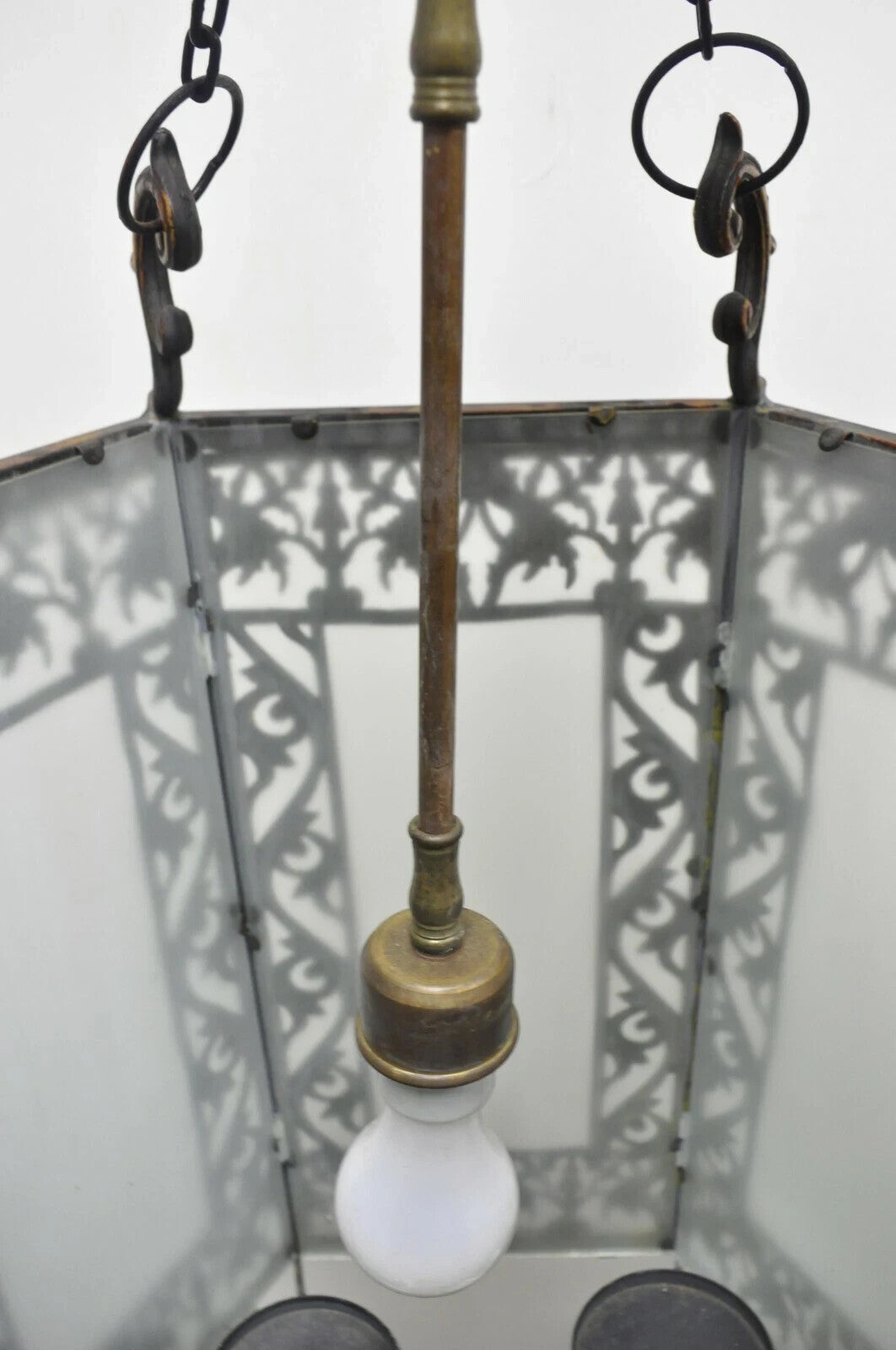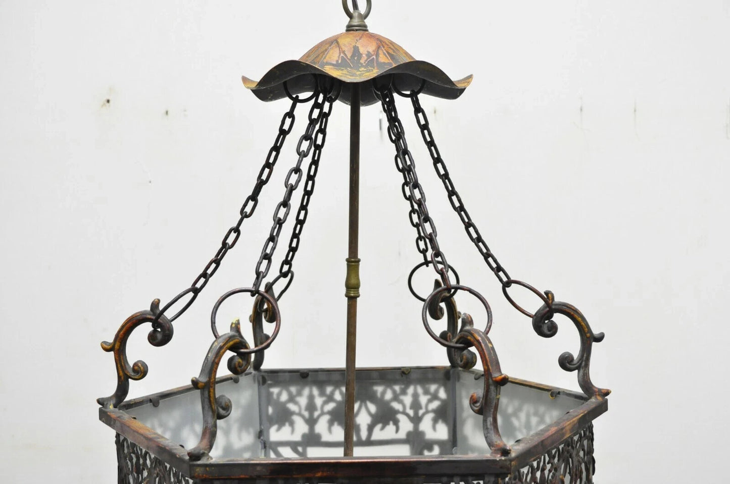 Art Nouveau Slag Glass Hexagonal Gilt Metal Pendant Light Chandelier Fixture