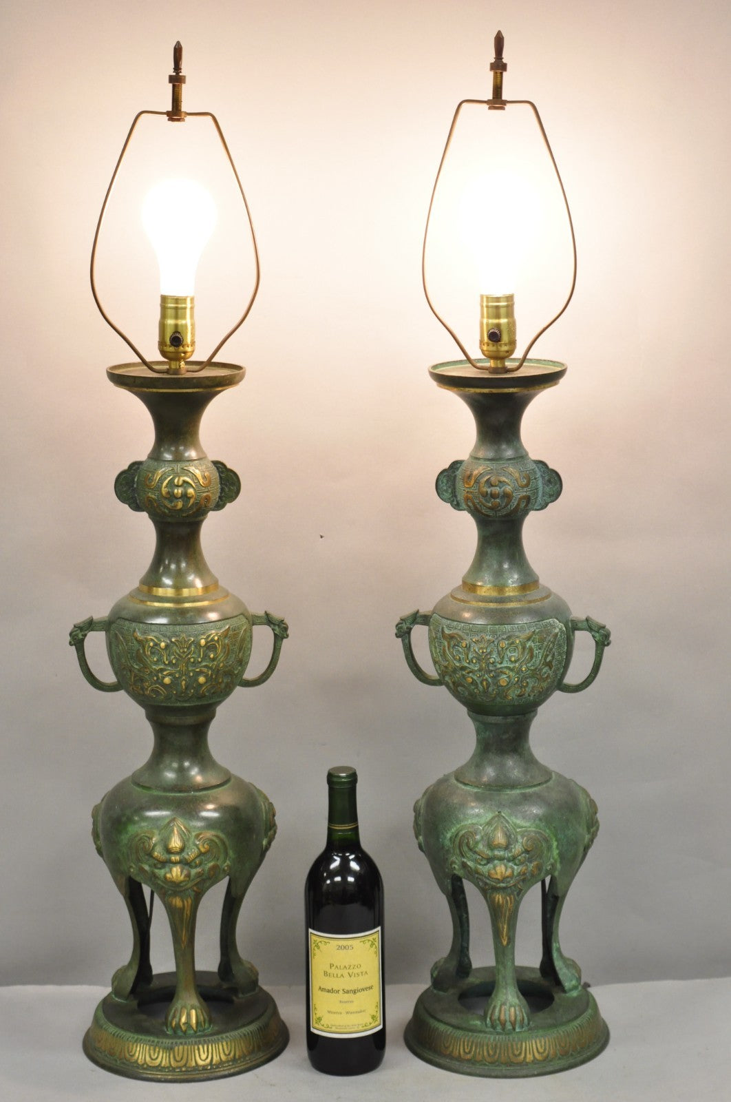 Vintage Chinoiserie James Mont Style Bronze Verdigris Chinese Foo Dog Figural Table Lamps (slight variance to finish) - a Pair. Circa Early 20th Century. Measurements: 38" H (to finial) x 29" H (to light socket) x 8" W x 8" D. {3-Way (Yes)}, (Location: Section 2)