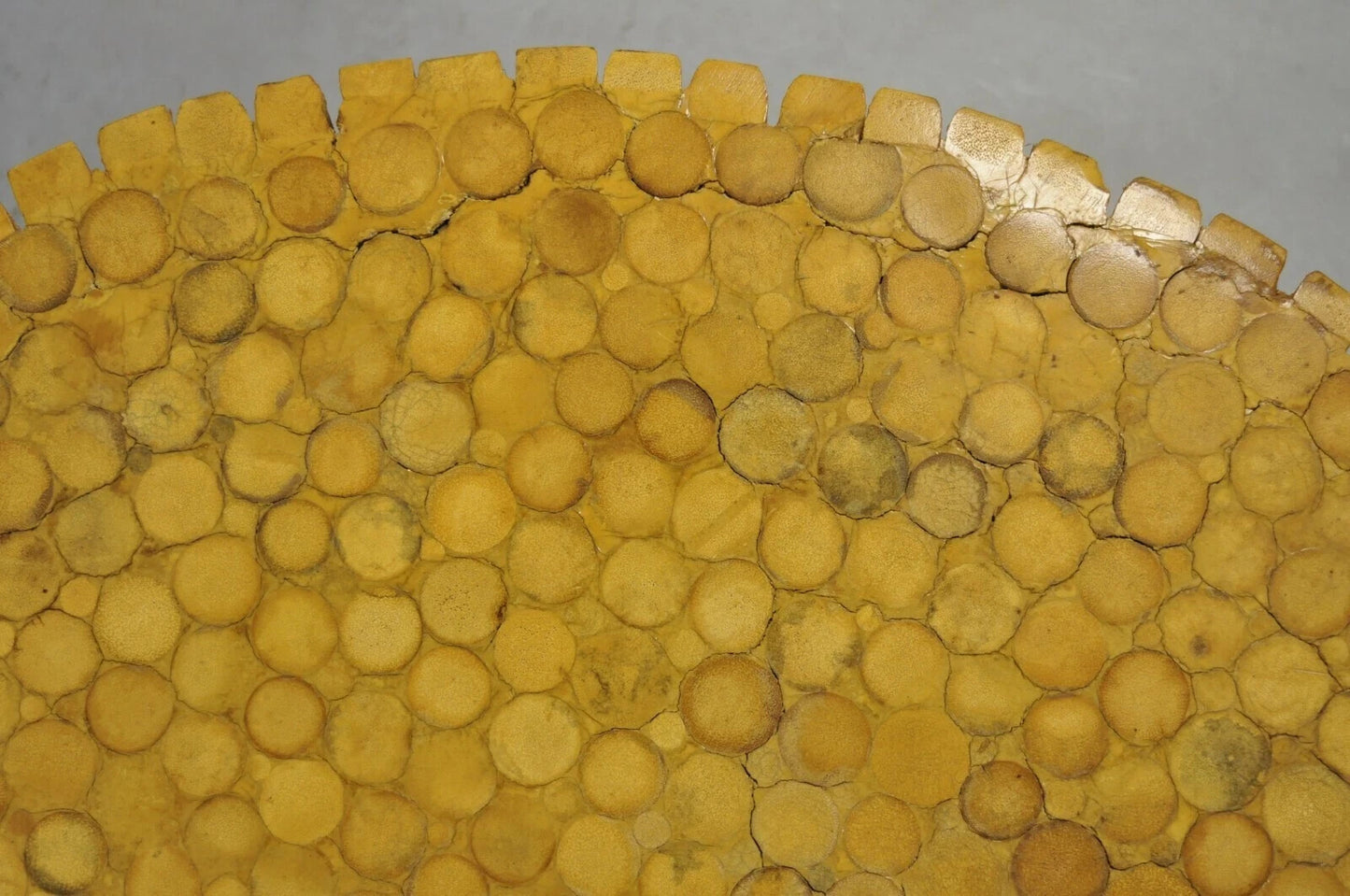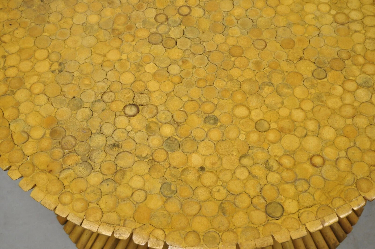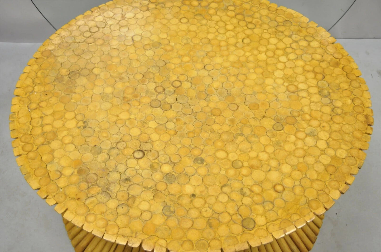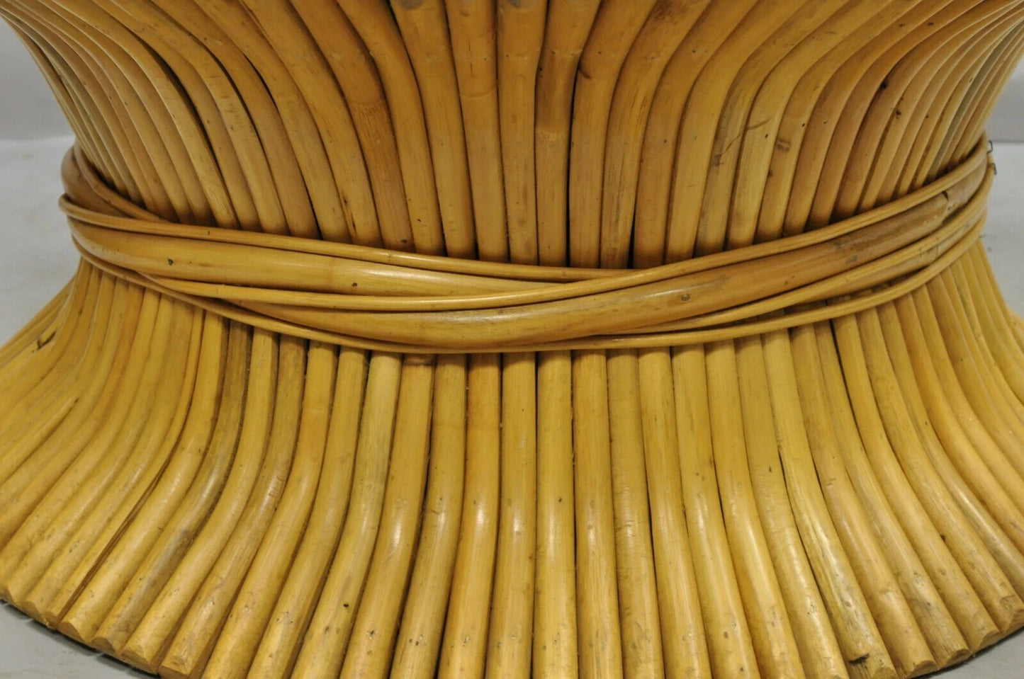 Vintage Hollywood Regency McGuire Style Sheaf of Wheat Bamboo 48" Glass Coffee Table. Item features a round glass top, sheaf of wheat bamboo style round pedestal base, great style and form, maker unconfirmed. Circa Late 20th Century. Measurements: 18" H x 48" Diameter Glass. 37" Diameter Base