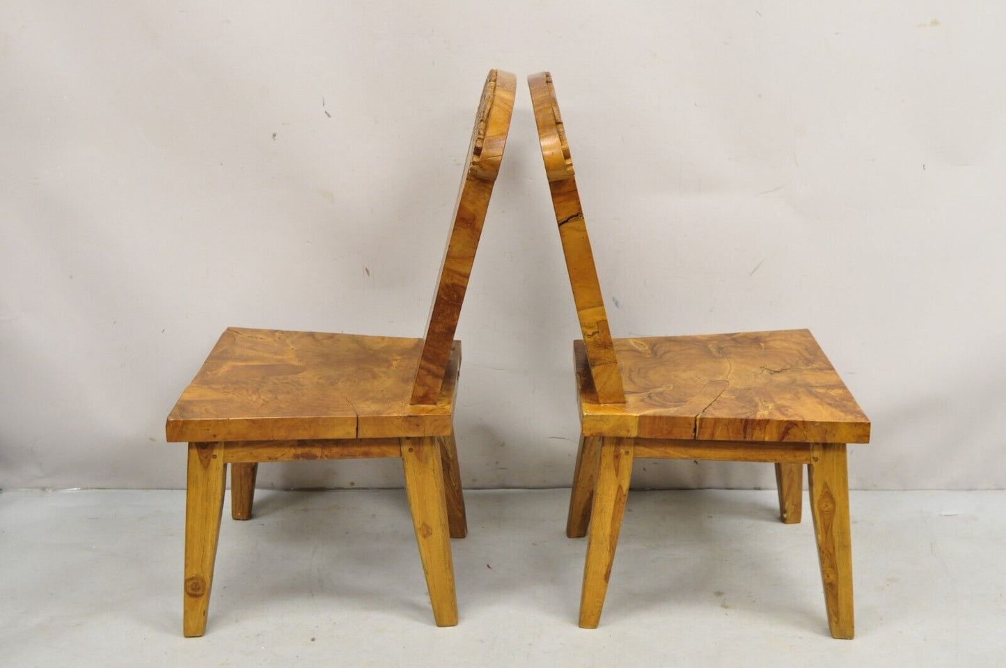 Item: Indonesian Carved Solid Burl Wood Slab Continental Figural Side Chairs - a Pair
