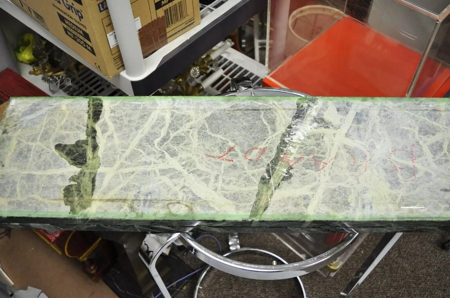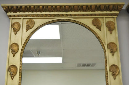Large Pair of Antique Italian Hollywood Regency Shell & Marble Grotto Console Hall Table & Mirror Sets. Listing includes (2) marble top console tables and (2) large impressive pier mirrors. Set features shell carved ornamentation and carved wood "seaweed" skirts, green marble tops, solid wood construction, cream & gold distressed finish, quality craftsmanship, great style and form. Similar to the works of Dorothy Draper and Edward Wormley. Circa Early 20th Century.