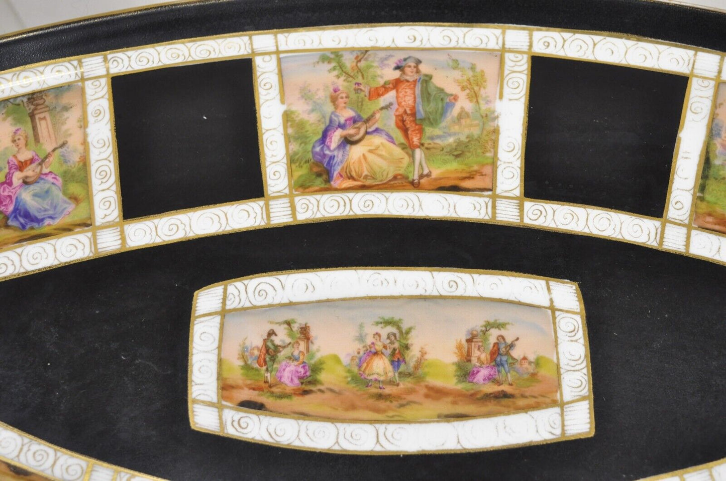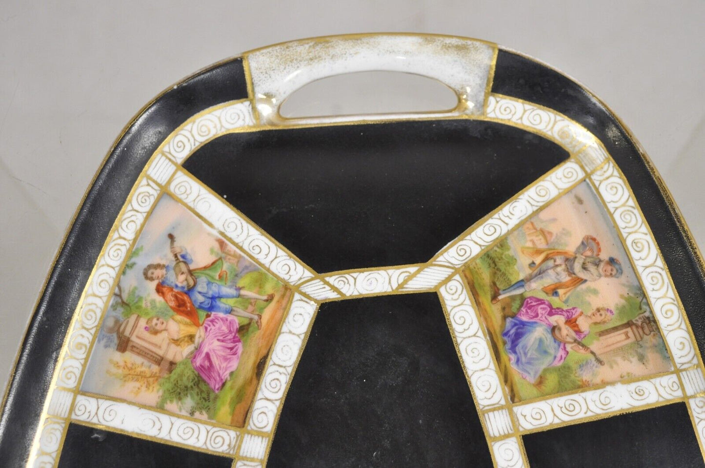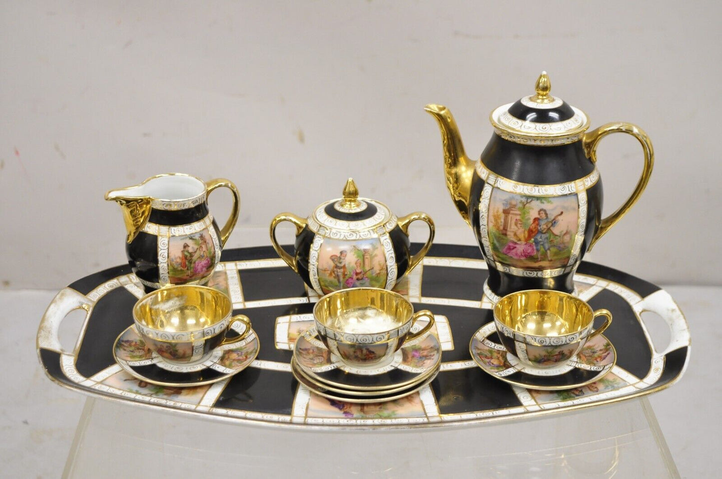 Antique Royal Vienna Style Bohemia Czecho-Slovakia Black Porcelain Tea Set - 12 pcs. Listing includes (1) tray, (3) cups, (5) saucers, (1) covered sugar bowl, (1) creamer, (1) teapot. Circa Early 20th Century.