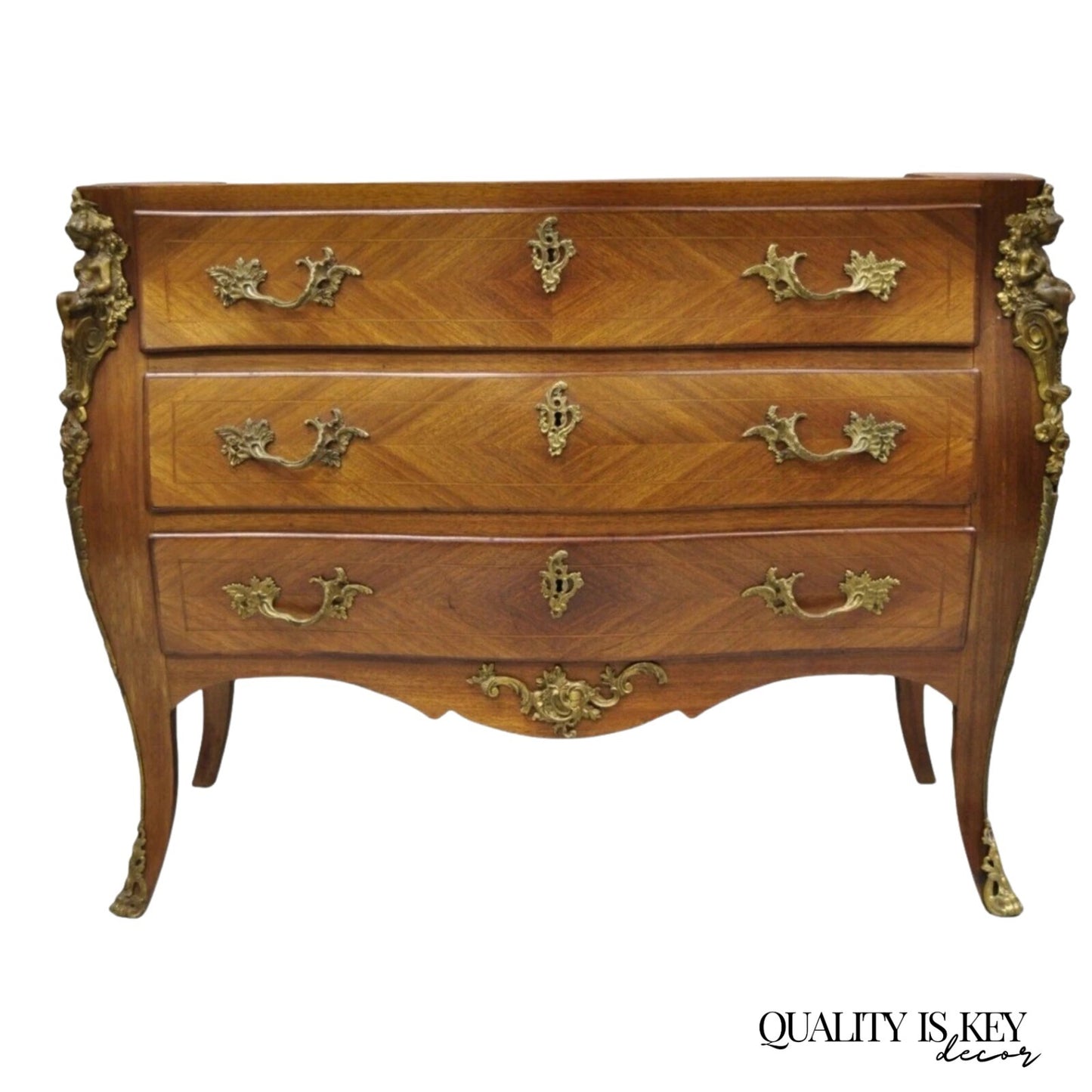 Vintage French Louis XV Style Bombe Commode Dresser Chest of Drawers w/ Cherubs (Marble top NOT included). Item features bronze ormolu, shapely bombe form, cherub figures to sides, beautiful wood grain, no key, but unlocked, 3 dovetailed drawers, cabriole legs. Circa Mid 20th Century. Measurements: 33" H x 43.25" W x 20" D.