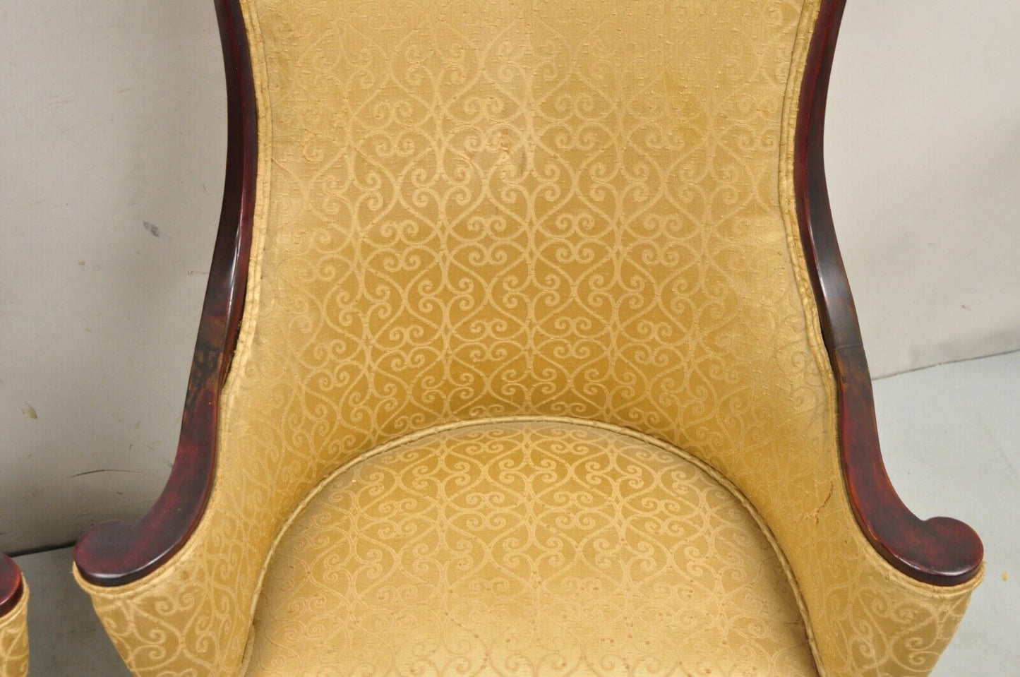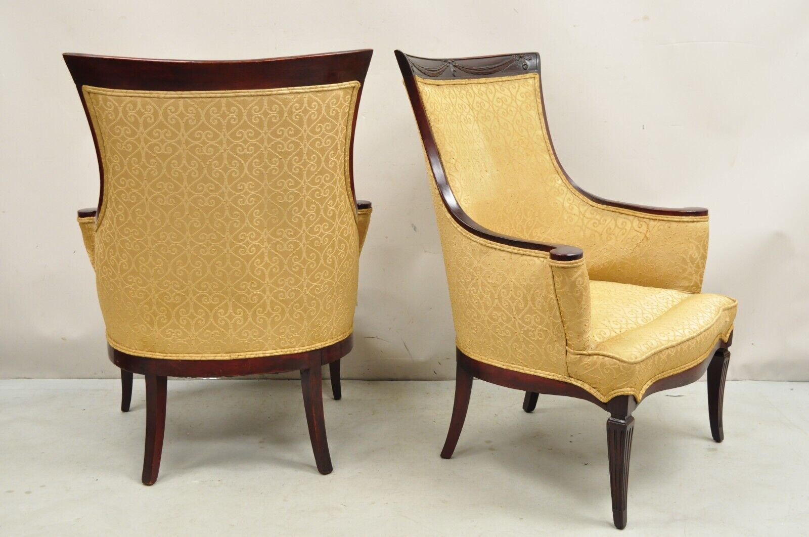 Vintage Hollywood Regency Drape Carved Mahogany Fireside Lounge Chairs - a Pair