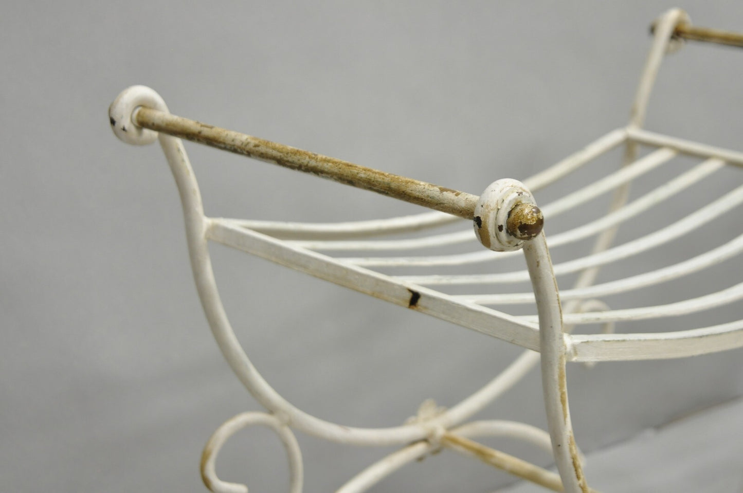 Vintage Italian Regency Style Wrought Iron & Brass Curule X Frame Stools with White Distress Painted Finish - a Pair. Circa Mid 20th Century. Measurements: 22" H x 24" W x 14" D x 17" Seat height.